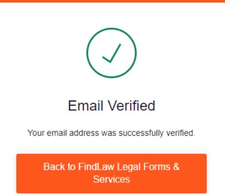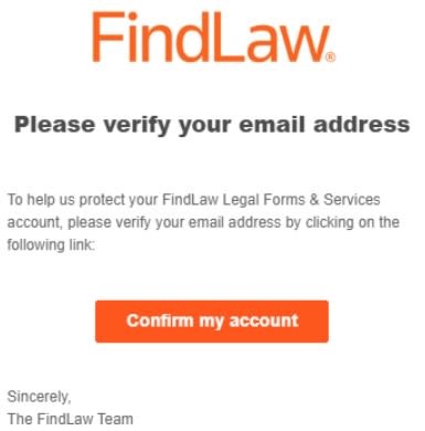 To verify your email address, access your email account and find the email with the subject line “Please verify your email address – FindLaw Legal Forms & Services”. Select the “Confirm my account” button.