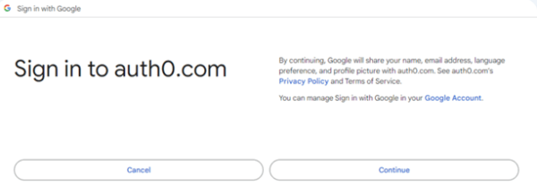 When signing into our secure system with Google, you'll need to click the "Continue" button when prompted.