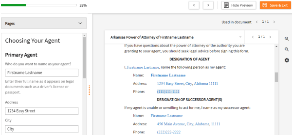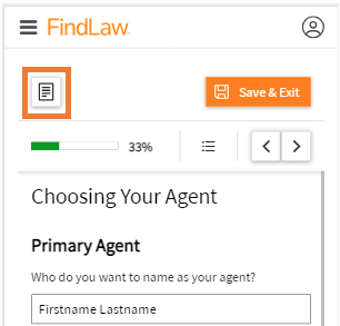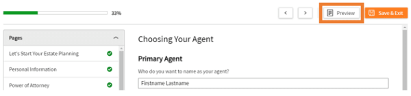 To preview your forms, simply click on the “Preview” button or icon. This feature allows you to see what your final documents will look like with the information you’ve entered to ensure that all details are correct and formatted properly before you finalize your documents. Simply click the “Preview” button or icon again to return to the questionnaire.