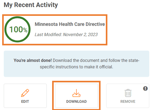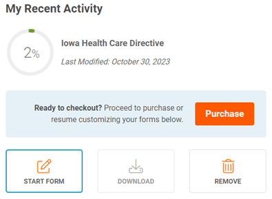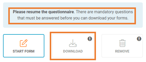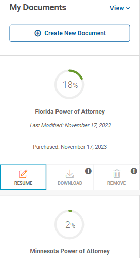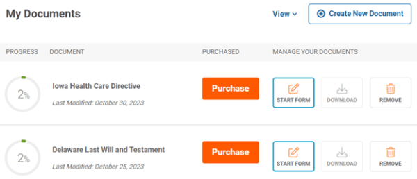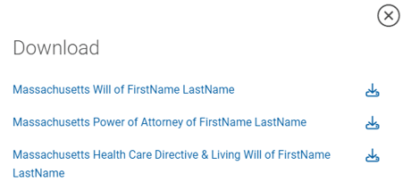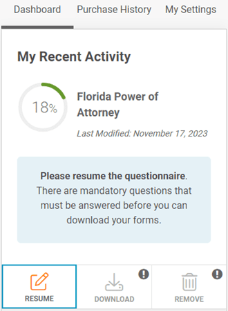 Any of your completed, purchased forms can be downloaded from your account dashboard by selecting the “Download” button and choosing which form to download if you purchased an estate planning package with multiple forms. Incomplete forms will display a “!” warning icon over the inactive "Download" button to let you know one or more mandatory questions are missing answers. Those questions will need to be answered before you can download your form.