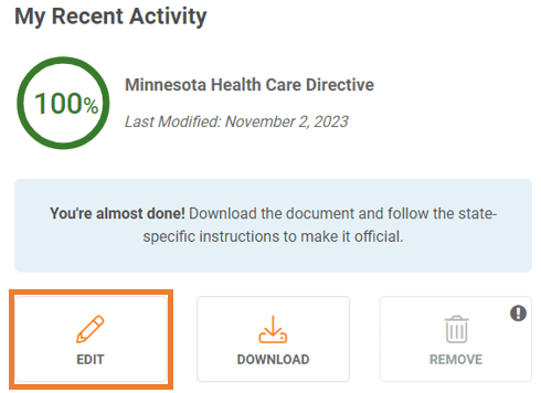 After you have created a secure account, you have the opportunity to save and modify your estate planning forms. Once you have purchased your will or other estate planning forms, you can easily revise your documents by selecting “Edit”.